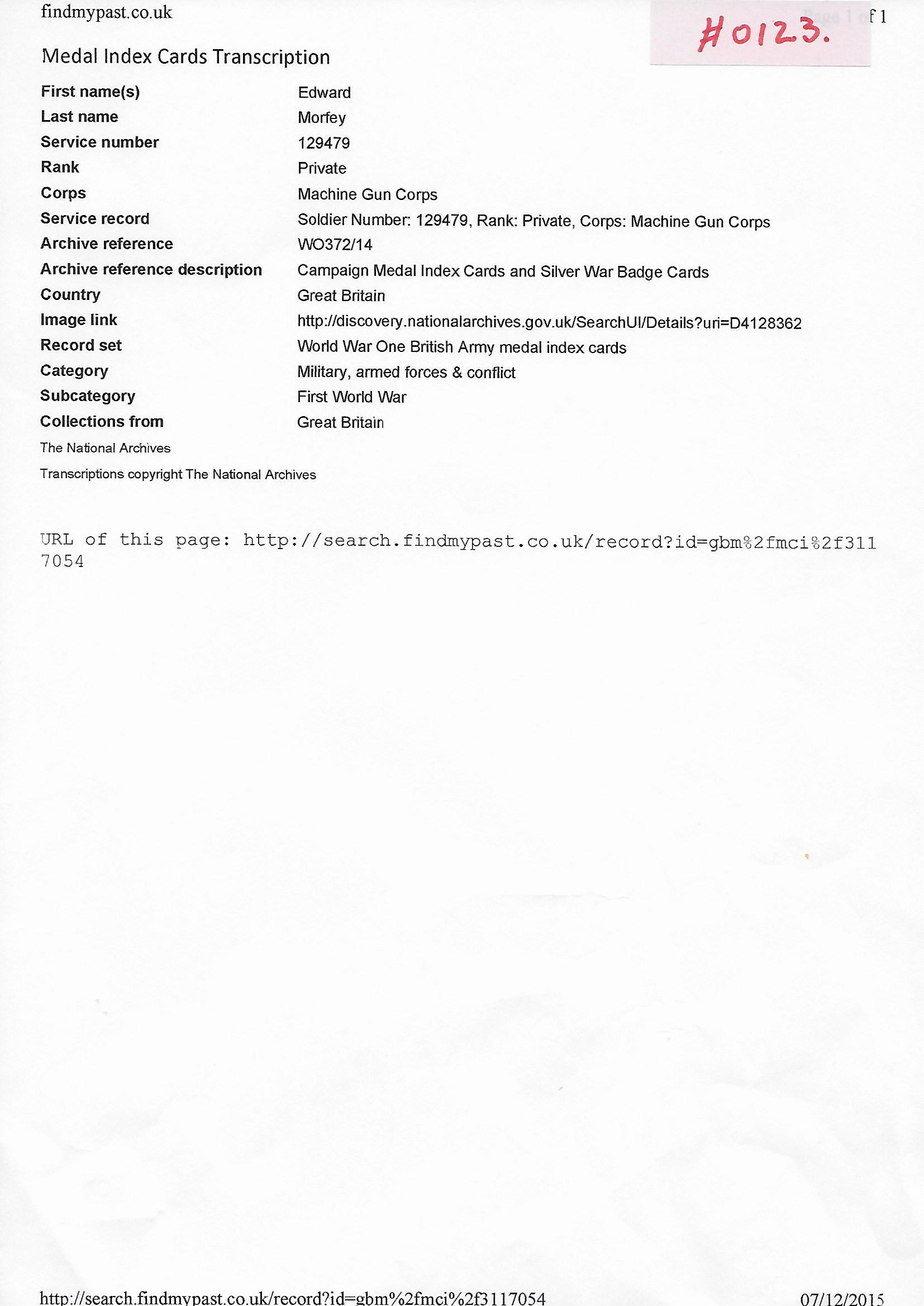 | 2 | Kensington, London, "#0123 Edward Morfey - Birth Cert." (Q4 1898, Vol.1a, Page 119). |