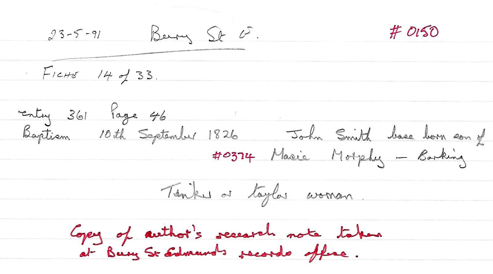 | 11 | Swainsthorpe, Norfolk, "#0150 John Smith Morfey Marriage Cert." (13th July 1889). Cit. Date: "4th May 2010". Assessment: Primary evidence. |